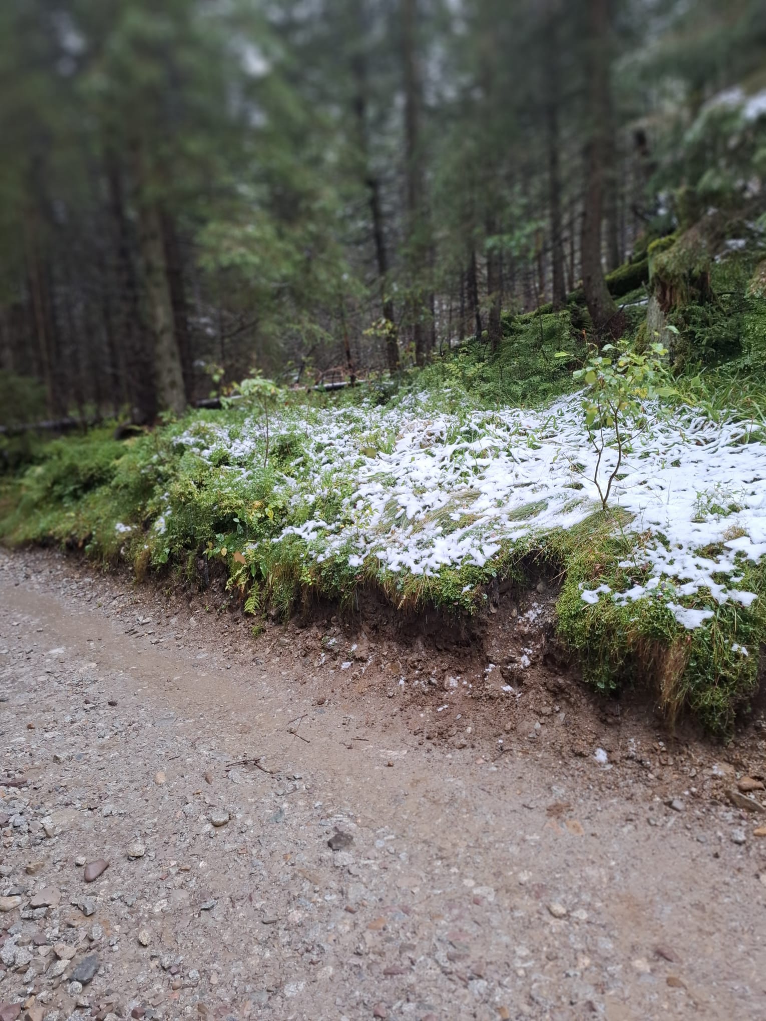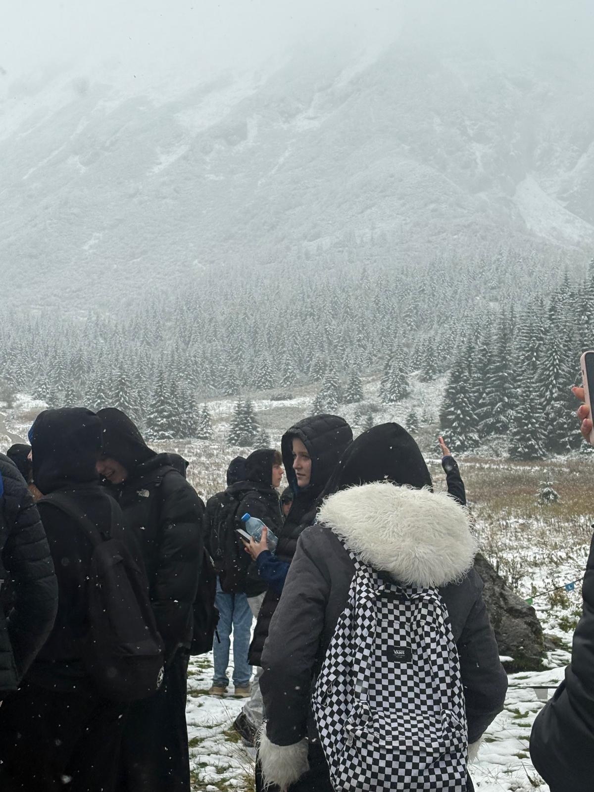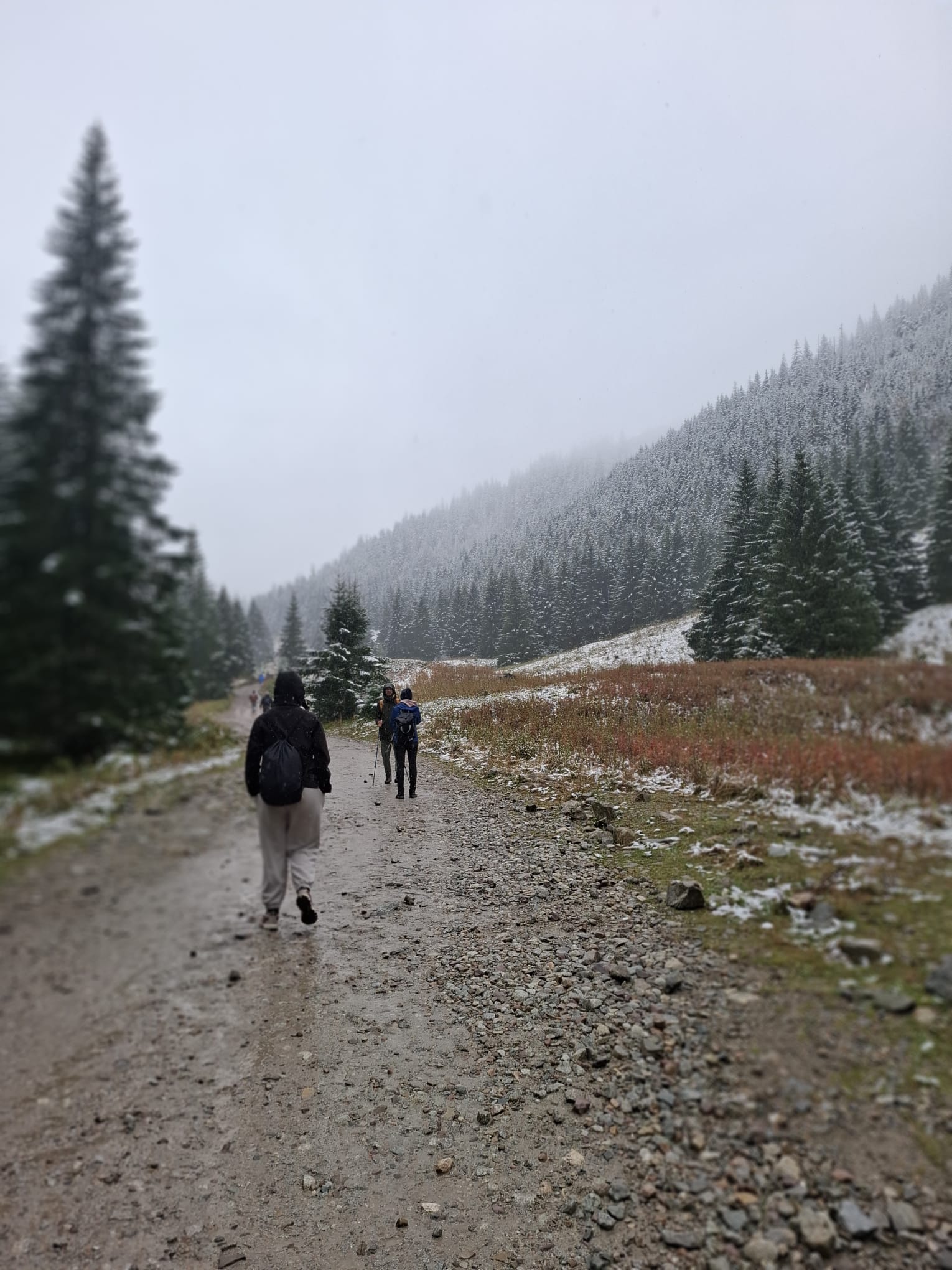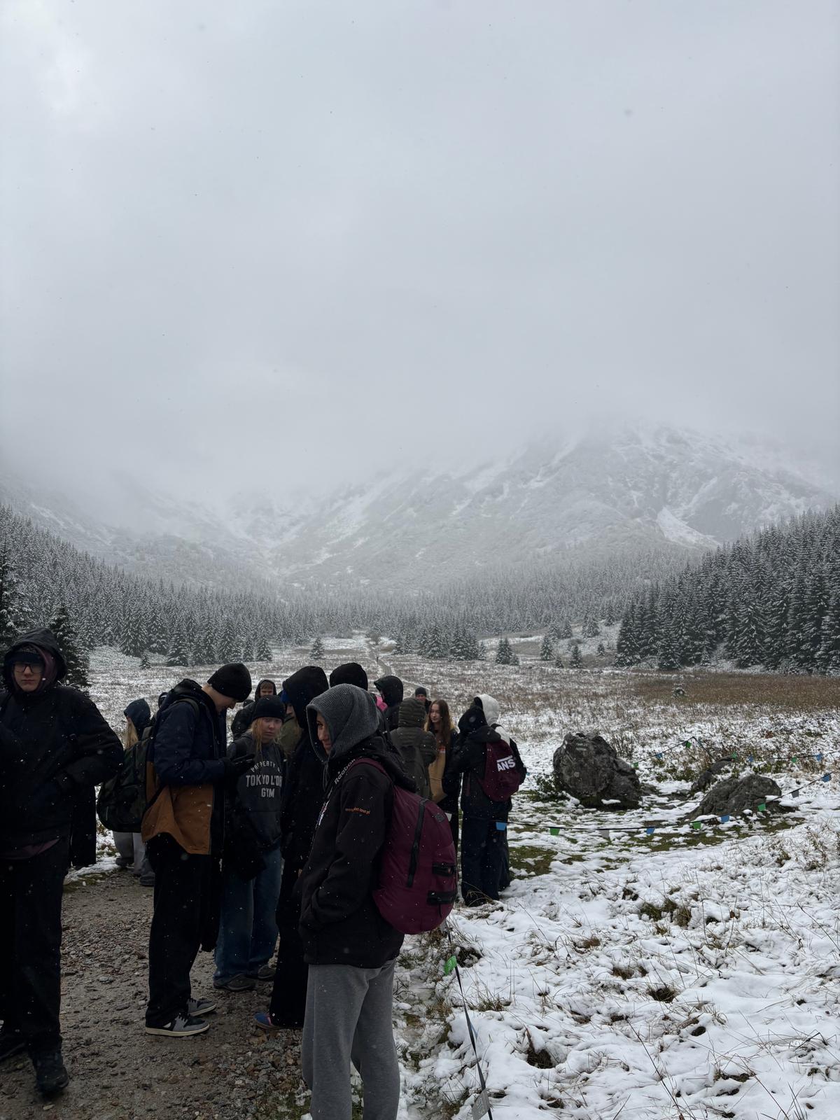 Z Poronina, gdzie spaliśmy , wyruszyliśmy na górski szlak. W drodze na Halę Konradowską mogliśmy cieszyć się nie tylko widokiem Tatr, ale także pierwszym padającym na nas w tym roku śniegiem.